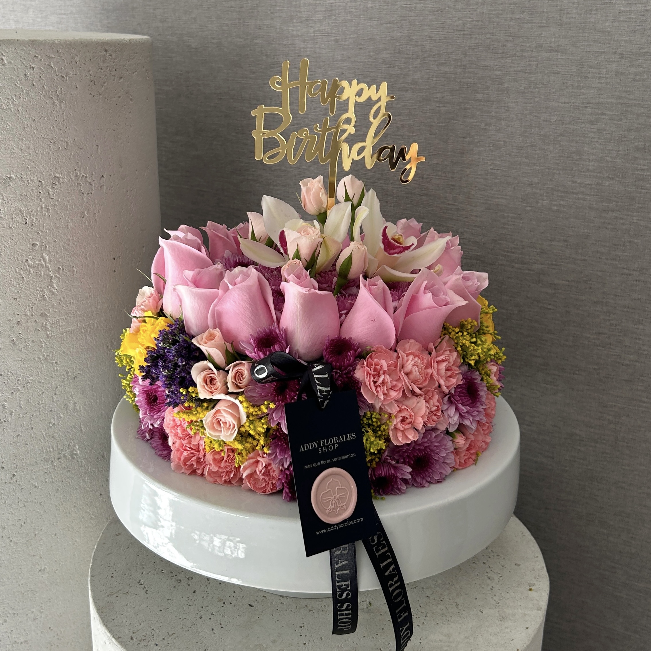 Este hermoso arreglo floral en forma de pastel, elaborado cuidadosamente sobre una elegante base de pastel combinando creatividad y elegancia para ser ese regalo inolvidable.