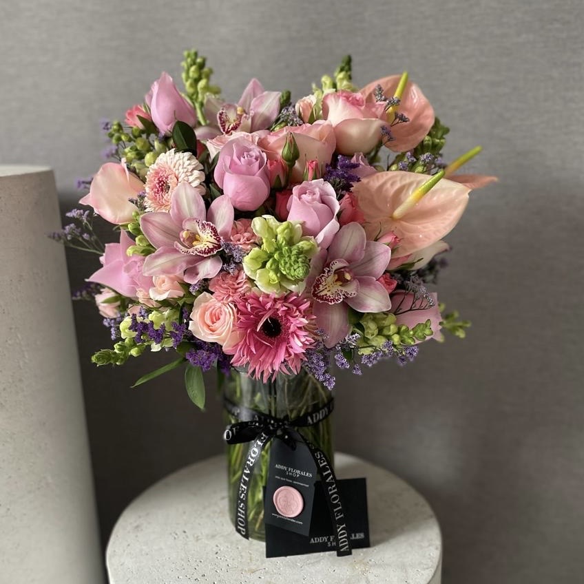 Un sofisticado arreglo en un florero de vidrio, donde la armonía de las rosas, gerberas, snapdragons y orquídeas cymbidium se fusionan en combinación de otras lindas flores,. Cada flor ha sido cuidadosamente seleccionada para hacer de este diseño algo lindo y moderno.