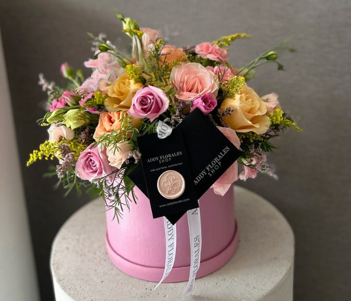 Un delicado arreglo en tonos rosados, lilas y amarillos. Diseñado en una linda caja color rosado transmitiendo ternura y alegría, siendo ideal para celebrar momentos especiales con un detalle moderno y encantador.